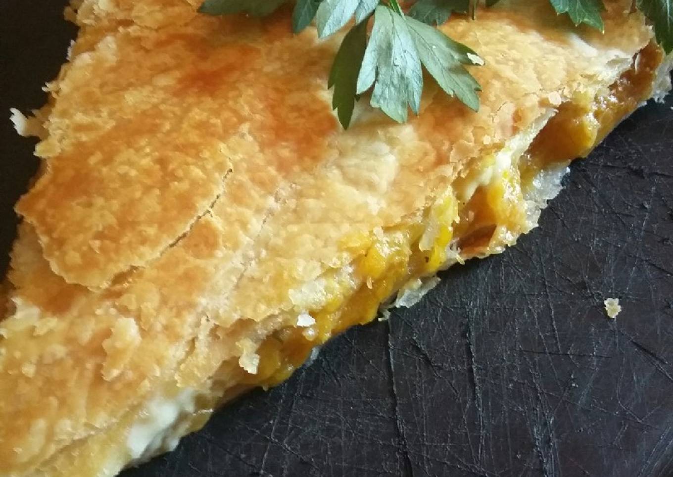 - Expandir sobre la tapa de tarta hojaldrada el relleno.