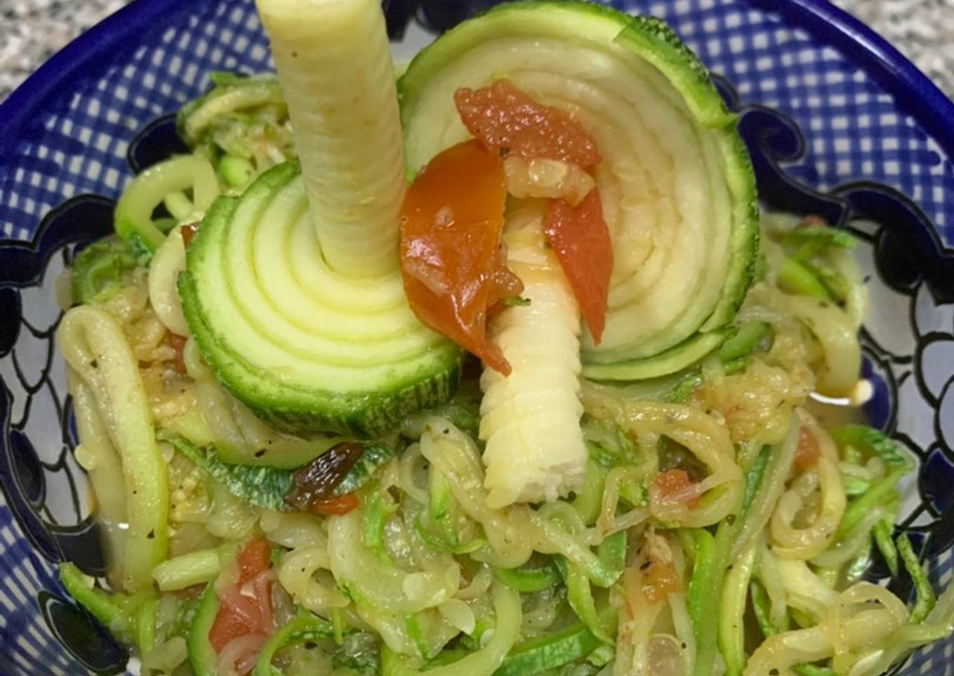 - En corte juliana o spiralizer haz tus calabacitas, puedes utilizar un pelador tradicional o ayudarte con los que ya venden en por Amazon.