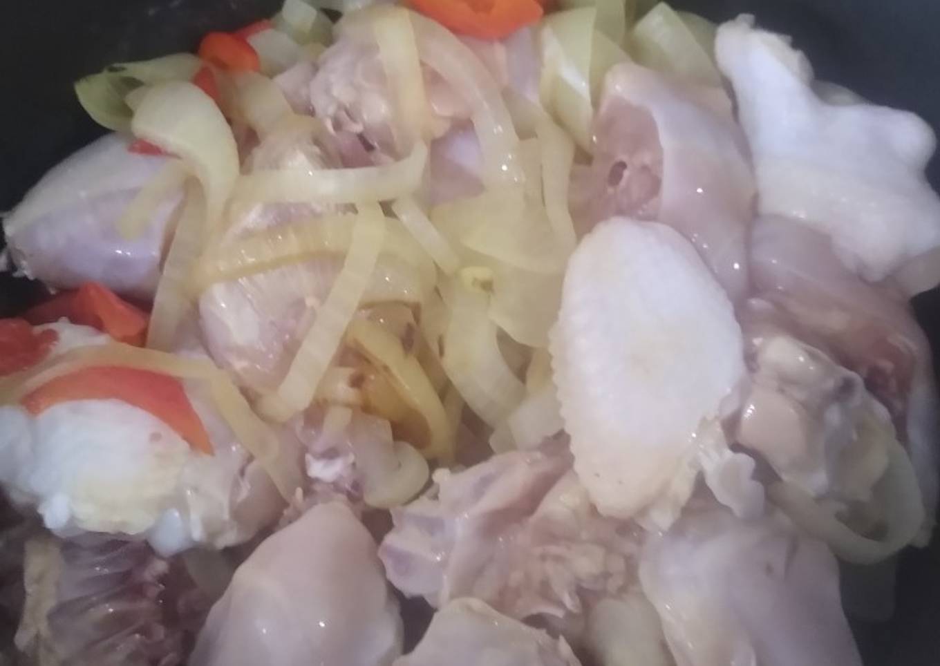 - Trozar el pollo a gusto añadir dejar tapada para que vaya soltando los jugos tanto la cebolla el morrón y el pollo