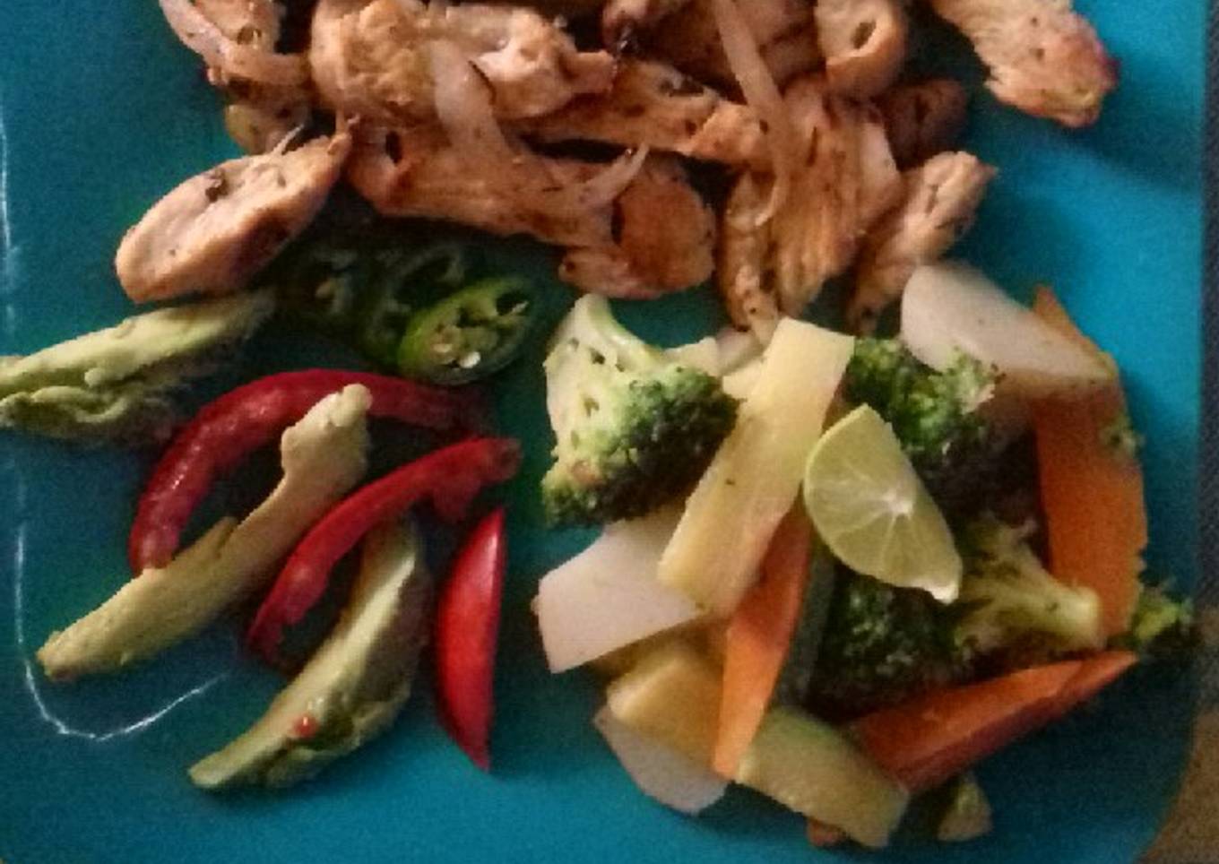 - Y la agregamos en un plato, acompañado de los vegetales, rebanadas de tomate, aguacate y por último unas rodajas de chile
