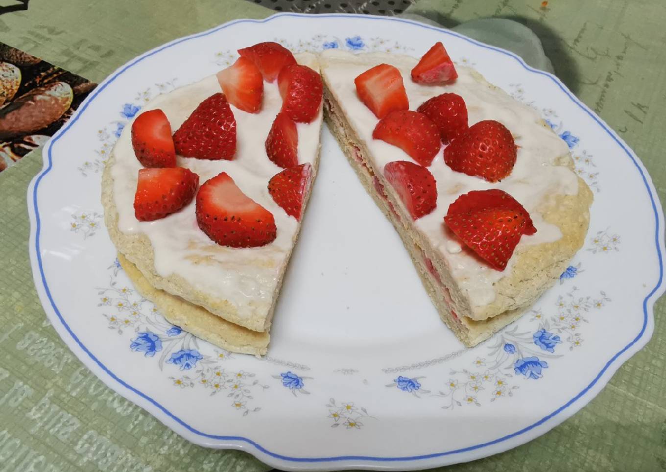 - Ya solo queda echar una capa de la mezcla encima de una tortita y después unas fresas cortadas en cuadraditos muy pequeños. Ponemos la otra tortita encima y el mismo proceso pero esta vez con fresas más grandes.