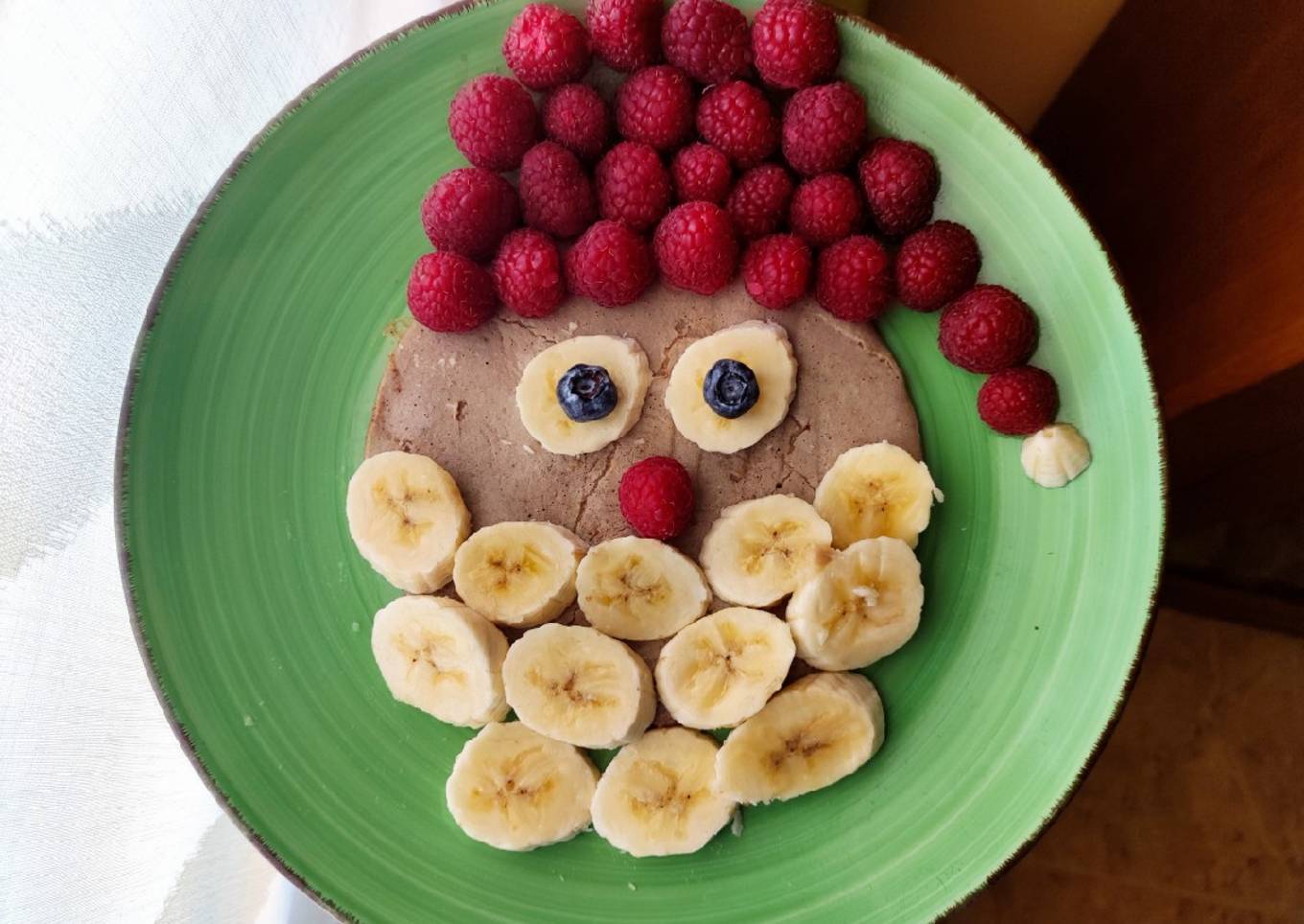 - Con el plátano laminado y dos arándanos frescos realiza los ojos. Debajo pon una frambuesa simulando la nariz