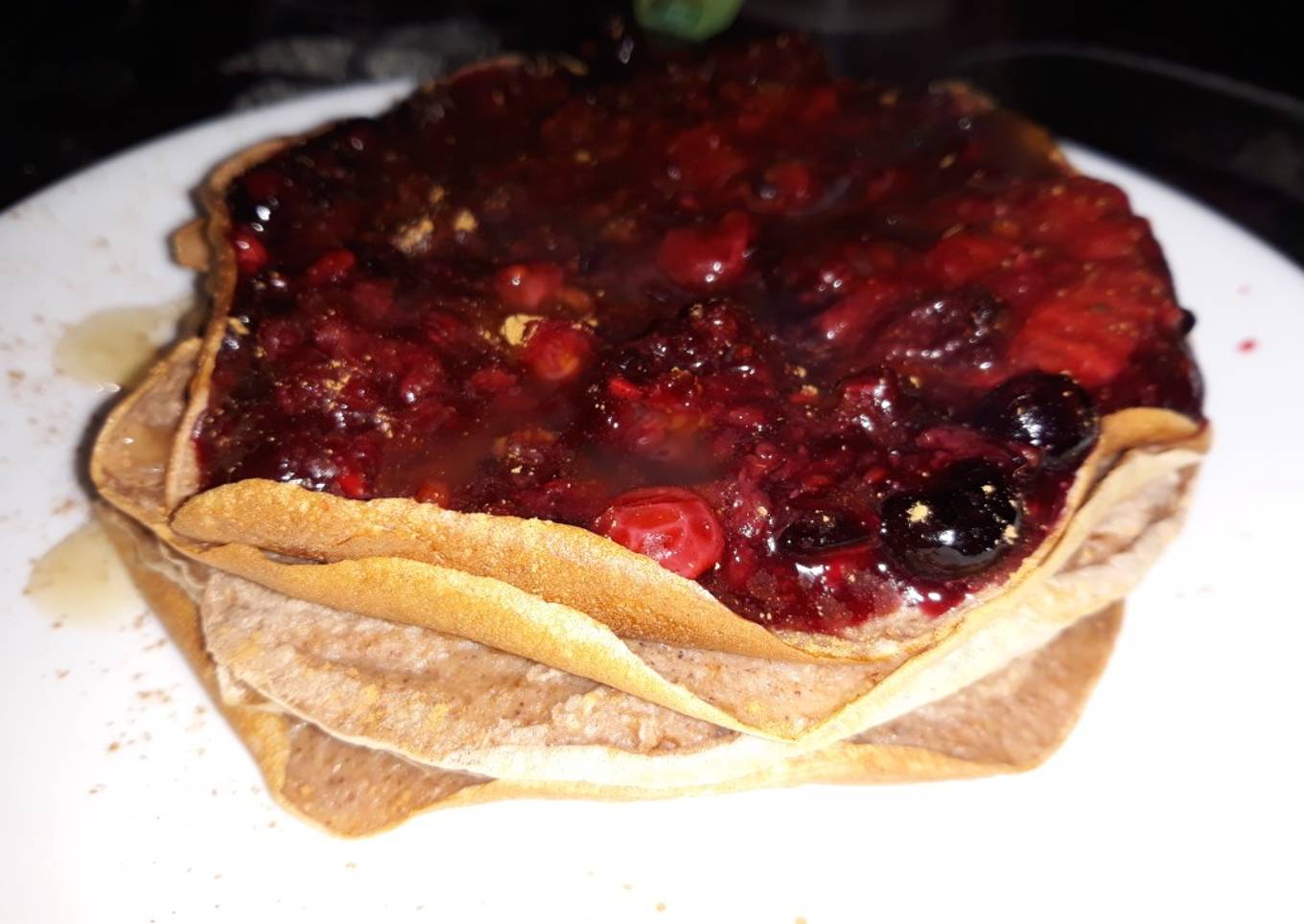 - Una vez listas, las colocamos en un plato y le ponemos la mezcla de frutos rojos por encima. En mi caso uso los que vienen congelados de mercadona, lo que hago es ponerlos en un vaso y meterlo al microondas durante 1 minuto o 1 y medio aproximadamente. Luego escurro el exceso de agua y le pongo unas gotitas de sacarina para endulzar.