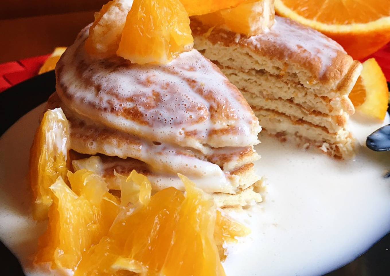 - Vertemos sobre las tortitas con la media naranja troceada y listas!