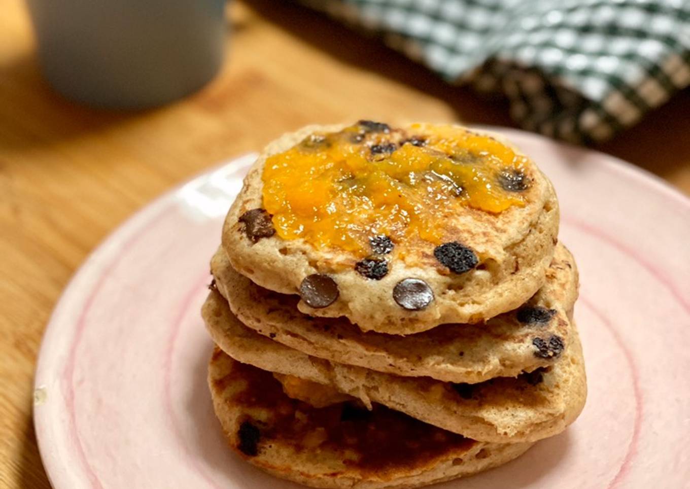 - Ponemos una plancha al fuego, le añadimos un poquito de aceite de coco y cuando esté bien caliente ponemos montoncitos de masa para cada tortita. Le ponemos unas pepitas de chocolate y dejamos hasta que les salgan burbujitas, damos la vuelta y cocinamos por el otro lado